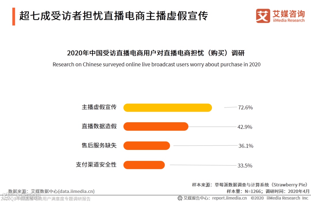 iiMedia Research(艾媒咨询)数据显示,72.6%的受访用户担忧直播电商主播虚假宣传,42.9%的受访用户担忧直播电商数据造假,超过30.0%的受访用户担忧直播电商售后服务缺失和支付渠道的安全性。艾媒咨询分析师认为,当前电商直播在虚假宣传监管以及售后服务链条的建设上,仍需进一步加强。