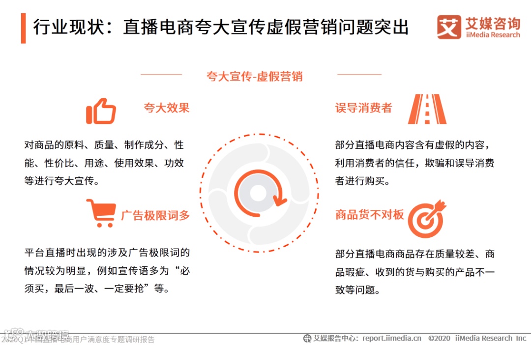 iiMedia Research(艾媒咨询)数据显示,72.6%的受访者担忧直播电商主播虚假宣传,42.9%的受访者担忧直播电商数据造假。目前,行业内普遍存在夸大效果、使用广告极限词、误导消费者、商品货不对板等问题,部分直播电商内容含有虚假宣传的内容,利用消费者的信任欺骗和误导消费者进行购买。