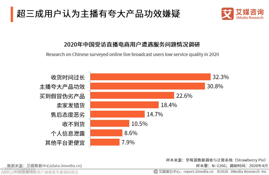 iiMedia Research(艾媒咨询)数据显示,32.3%的受访用户遇到过收货时间过长的问题,30.8%的受访用户遇到过主播夸大宣传的问题。艾媒咨询分析师认为,直播电商当前仍存在较多服务质量问题,行业环境有待规范。