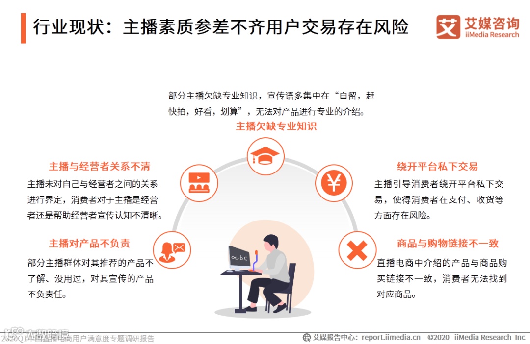 目前,直播电商的部分主播存在对产品不负责任、虚假宣传、私下交易等问题。艾媒咨询分析师认为,这些问题导致用户交易存在风险,相关平台应重视对主播素质的管控并加强对主播群体的规范。
