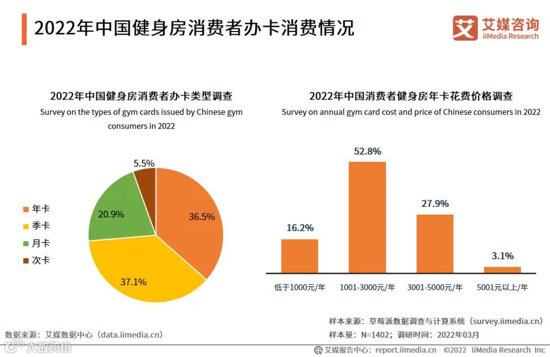 调研数据显示,消费者办理健身卡的形式主要是以季卡(37.1%)和年卡(36.5%)为主;按年卡计算,平均价格在1001-3000元区间内。