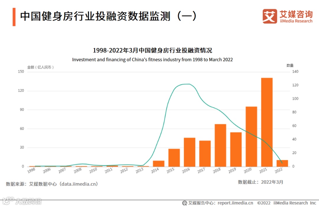数据显示,2021年中国健身房行业全年投融资金额达62.3亿人民币,投融资数量达17起。随着全民健身观念的日渐增强,大众对于运动健身的需求日益旺盛,由此促使健身房市场也在不断扩张。