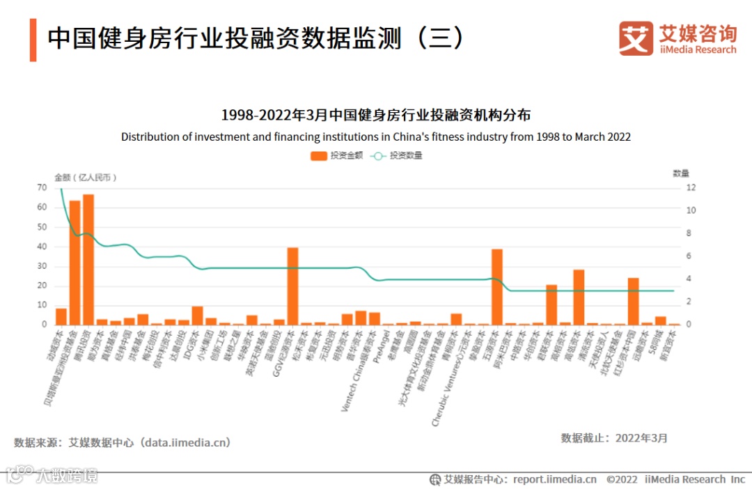 数据显示,截止2022年3月,中国健身房行业投资金额最高的机构是腾讯资本,达66.9亿人民币;投资数量最多达12起,为动域资本。
