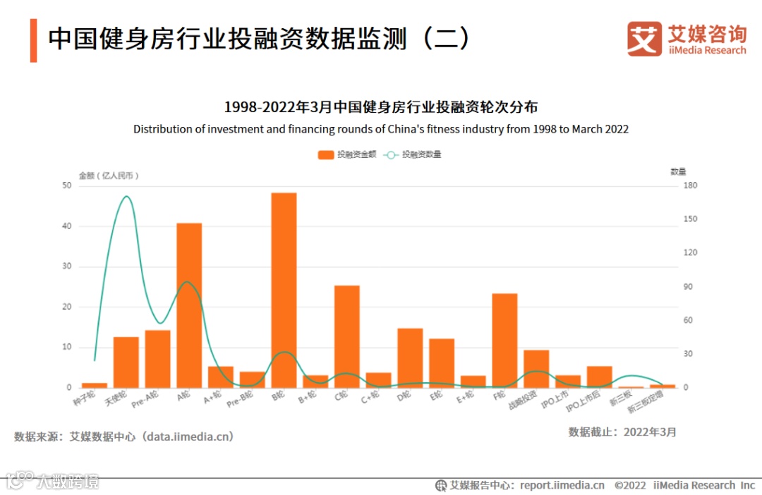 数据显示,截止2022年3月,中国健身房行业投融资轮次主要集中在初期,天使轮投融资数量达171起;B轮金额最高,达48.3亿人民币。