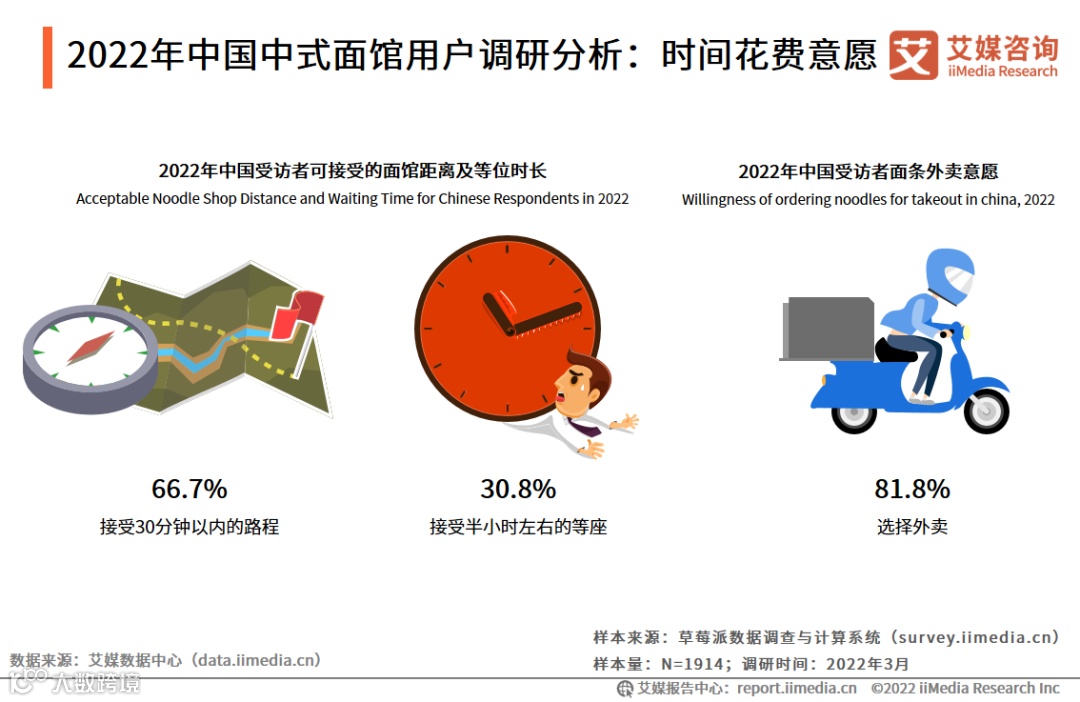 iiMedia Research(艾媒咨询)调研数据显示, 66.7%的受访者仅接受30分钟以内的路程,30.8%的受访者能够接受半小时左右的面馆等座,81.8%的受访者选择外卖的方式购买面条。