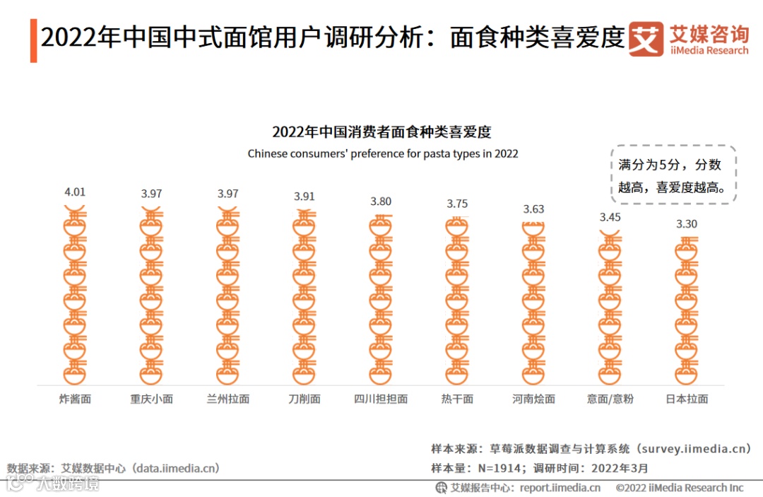 iiMedia Research(艾媒咨询)研数据显示,在面食种类中,消费者对中式面条的喜爱程度较高。其中,炸酱面的喜爱度最高,为4.01分。而受访者对意面/意粉和日本拉面的喜爱程度较低,分别得分3.45和3.30。