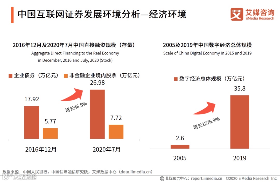 数据显示,中国直接融资规模不断增长,2020年7月企业债券和非金融企业境内股票融资合计达到34.70万亿元,较2016年12月增长46.5%。同时,中国数字经济总体规模达到35.8万亿元,占GDP比重达36.2% 。艾媒咨询分析师认为,一方面,近年企业融资意愿提升,而随着金融市场机制完善,社会融资结构不断优化,直接融资规模进一步增长,客观上有利于总体券商业务提升;另一方面,国家一直鼓励支持数字经济建设,券商企业借助通信技术、人工智能、大数据进行互联网化转型也得以快速发展。