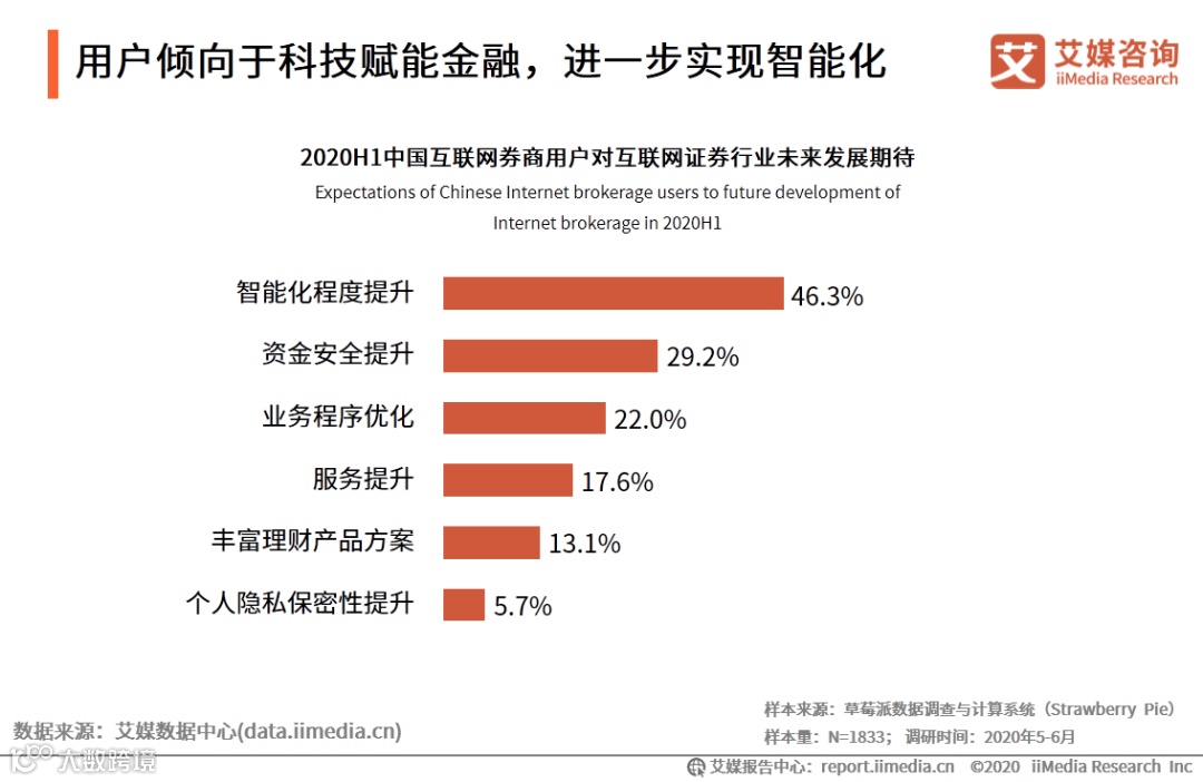 iiMedia Research(艾媒咨询)数据显示,46.3%的受访中国互联网券商用户期待在未来科技赋能金融,进一步实现智能化。艾媒咨询分析师认为,随着科技的不断进步,互联网证券行业在未来将继续与大数据、云计算等技术融合、创新,进一步实现转型发展,提升在市场中的竞争力。
