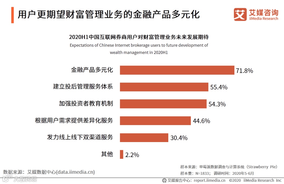 iiMedia Research(艾媒咨询)数据显示,71.8%的受访中国互联网券商用户期待在未来财富管理业务的金融产品能更多元化。艾媒咨询分析师认为,用户对于平台能提供交易的金融产品丰富度有较高需求,但多样化业务的开展也需要平台有足够资质,因此头部平台的优势将在未来行业竞争中体现得更为突出,行业马太效应明显。