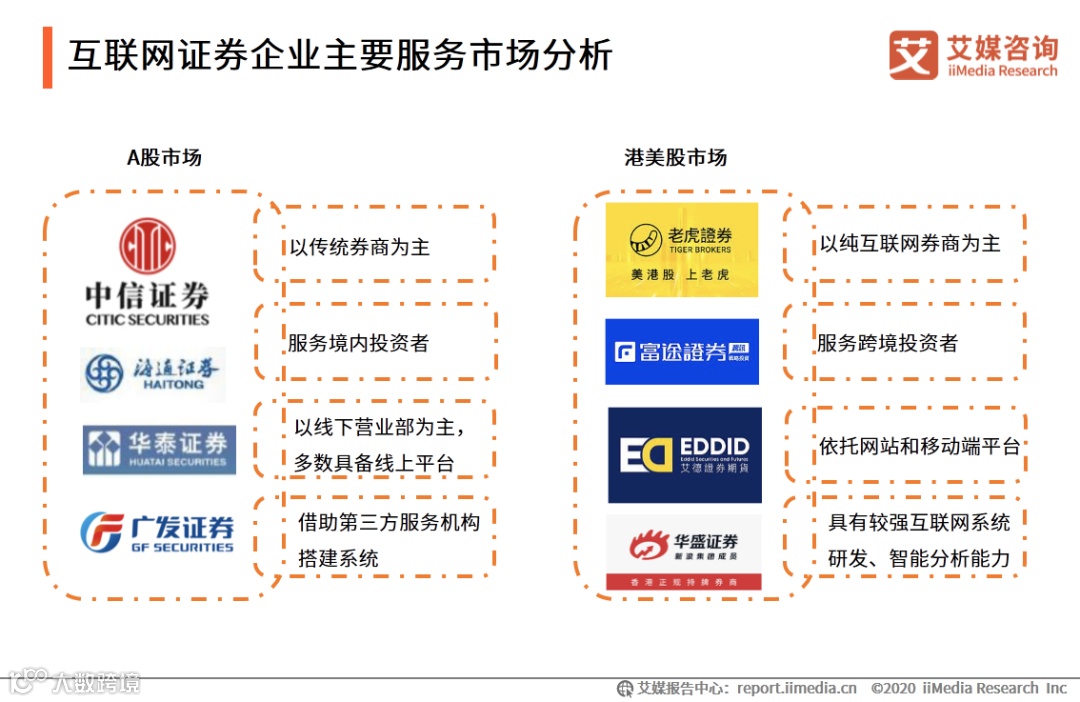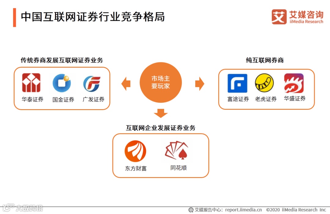 中国互联网证券行业中主要包括三类竞争者:以线下业务为基础并引入线上平台的传统券商,特点是发展历史较长、处于稳定增长期、立足于A股市场,以华泰证券为代表;单纯发展线上业务的纯互联网券商,特点是发展历史较短、速度较快、多立足于美港股市场,以老虎证券及富途证券为典型代表;以及发展了证券业务的互联网企业,特点是以互联网平台为基础、提供一站式服务,以东方财富为代表。