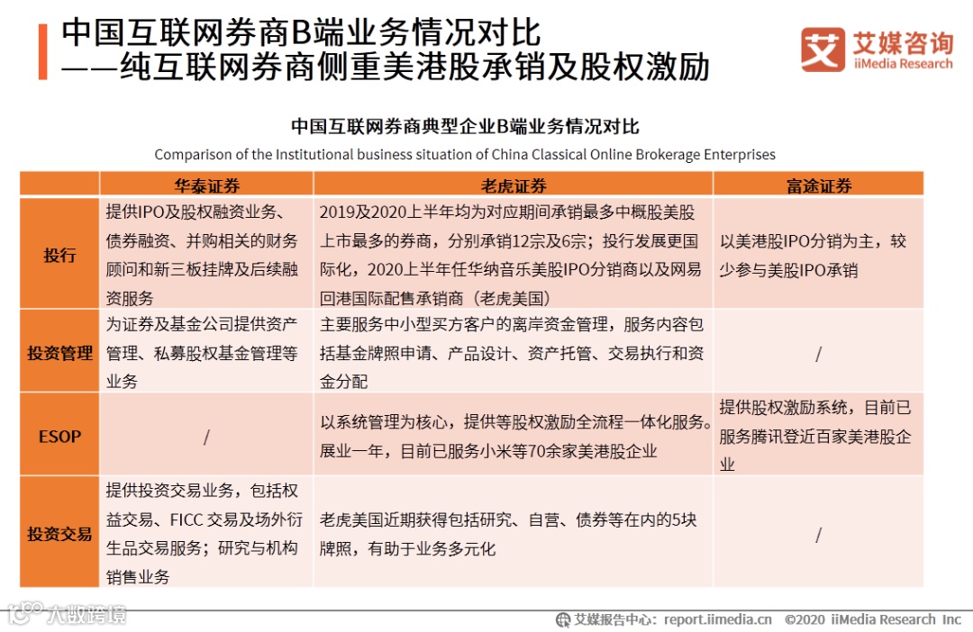 以华泰证券为代表的传统券商龙头B端业务集中于A股市场,业务范围更广,能整合投资银行、机构投资者服务和投资交易资源,为各类企业及金融机构客户提供全方位的综合金融服务,发展更成熟。老虎证券、富途证券等纯互联网券商近两年才开展机构业务,发力点主要在美港股IPO承销、分销,国际化水平较高,且发展速度快。同时,美港股上市公司普遍存在股权激励需求促使这类券商在B端发力股权管理服务。