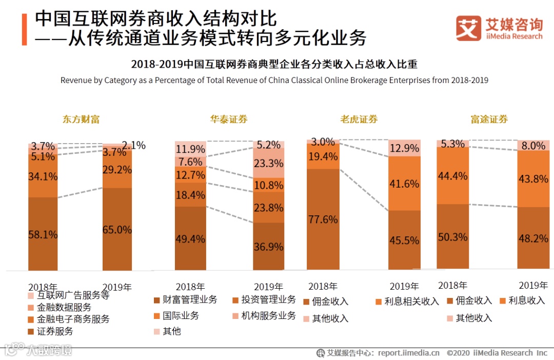 中国互联网券商收入结构对比——从传统通道业务模式转向多元化业务