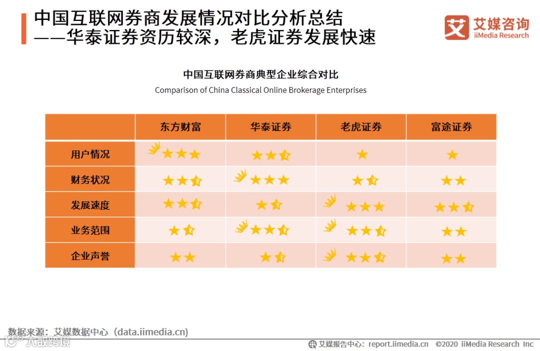 iiMedia Research(艾媒咨询)数据显示,总体而言,华泰证券由于发展历史较久,在体量上相对更大,用户数量、财务状况和业务范围都较优秀;但老虎证券近年增长较快,体现在B端业务的发展及财务增长两方面,企业声誉形象也最为正面。