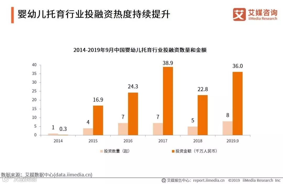 二胎政策全面放开以来,资本加速布局婴幼儿托育行业。2015到2017年间婴幼儿增长明显,资本涌入也达到了一个峰值,2017年投融资金额近3.9亿人民币。截止9月份的数据,2019年的投融资数量和金额已接近2017年的峰值数,2020年投融资规模有望进一步扩大。艾媒咨询分析师认为,随着2019年5月婴幼儿照护指导意见的颁布,未来资本将加速入场,投融资热度将持续提升。