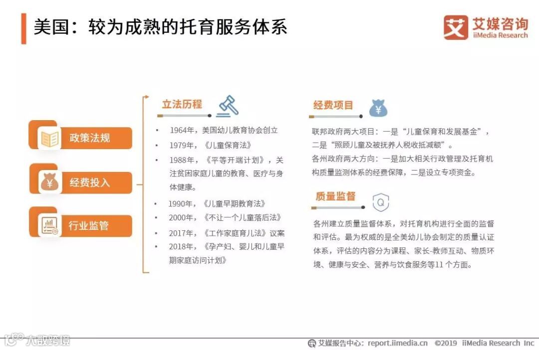 美国幼儿托育事业起步较早,政府对儿童发展及幼儿托育高度重视,将幼儿托育纳入公共服务体系,通过立法保障经费投入和推行质量评价系统,推进婴幼儿托育服务发展。2018年,国会通过了美国有史以来最大的育儿与发展整笔拨款增加计划( CCDBG),为美国各州提供了超过20亿美元的资金,用于每年额外投资儿童保育。经过几十年的发展,在政府支持和市场化运作下,美国托育服务体系发展比较成熟。