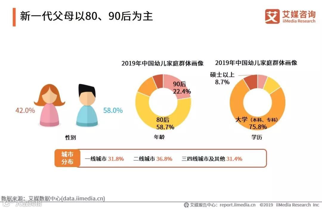 iiMedia Research (艾媒咨询)数据显示,2019年中国幼儿家庭中,0-3岁的婴幼儿父母主要以80、90后为主,大学本科以上学历占到八成以上。艾媒咨询分析师认为,随着育儿观念的转变和职业发展的追求,以80、90后为主的新一代父母更注重职业发展,同时也关注婴幼儿照料问题。