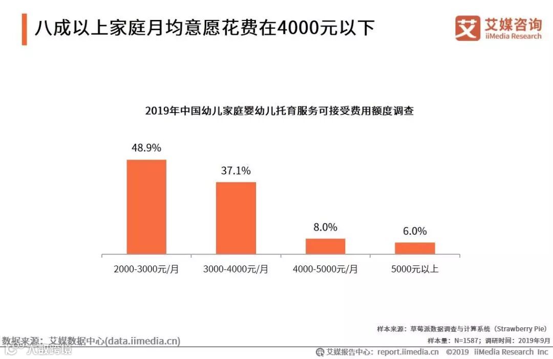 iiMedia Research(艾媒咨询)数据显示,2019上半年,八成以上的受访幼儿家庭可接受托育机构2000到4000元每月的收费制度,其中2000-3000元每月的比例占到48.9%。艾媒咨询分析师认为,目前托育市场每月收费普遍在5000元左右,而大部分中国幼儿家庭可接受最高费用在4000元左右,收费问题仍是众多家庭考虑婴幼儿托育服务的重要因素之一。