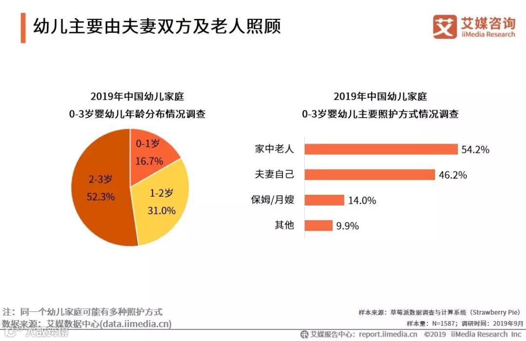 iiMedia Research (艾媒咨询)数据显示,2019年中国幼儿家庭中,2-3岁幼儿比例占到一半以上,而一岁以下幼儿占比较少。目前,3岁以下婴幼儿主要由夫妻双方和家中老人照顾,而家中老人照顾占比高于夫妻照顾,达到54.2%。艾媒咨询分析师认为,0-3岁婴幼儿年龄较小,照护时间、精力投入需求较高,现在中国幼儿家庭普遍习惯由夫妻双方和家中祖辈来照顾幼儿。此外,以80、90后为主的年轻父母更多会选择回归职场,将幼儿交由家中老人照顾。