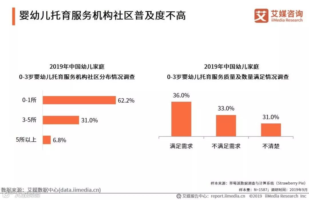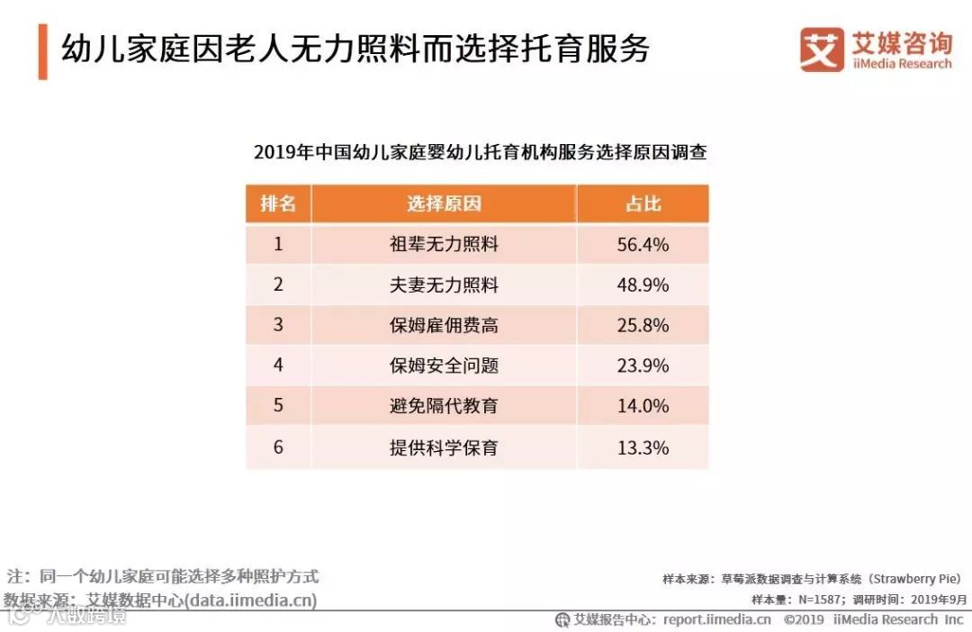 iiMedia Research(艾媒咨询)数据显示,2019年,近六成的受访幼儿家庭因家中祖辈无力照看孩子,而选择婴幼儿托育服务机构,夫妻无力照料紧随其后。艾媒咨询分析师认为,由于中国幼儿家庭面临着新一代父母发展意愿和生育意愿间难以平衡,家中祖辈无力照料孩子、保姆带孩存在安全隐患等问题,对专业的婴幼儿托育服务的需求是显而易见的。目前中国幼儿家庭的婴幼儿托育需求日趋强烈,这也是未来的发展趋势。