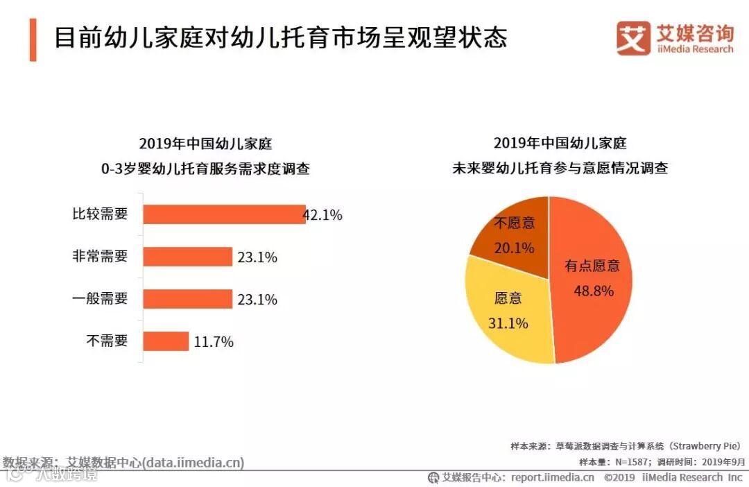 iiMedia Research(艾媒咨询)数据显示,2019年,在婴幼儿养育过程中关于专业托育服务需求度的调查上,认为比较需要的幼儿家庭占比最大,达到42.1%。而在未来参与意愿方面,只有31.1%的幼儿家庭愿意接受婴幼儿托育服务。艾媒咨询分析师认为,当前中国婴幼儿托育市场发展还未成熟,幼儿家庭对婴幼儿托育仍有所疑虑,对未来中国3岁以下婴幼儿托育市场发展呈观望状态。