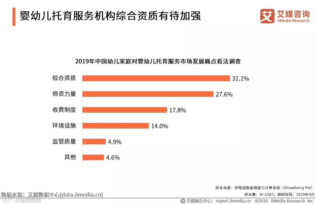 iiMedia Research(艾媒咨询)数据显示,目前中国3岁以下婴幼儿托育服务机构综合资质有待加强,其次在教师专业性、收费制度以及环境设施上也存在不同程度的问题。艾媒咨询分析师认为,中国婴幼儿托育服务机构在软硬件上皆有较大的改善空间,随着政策规范和市场化运作,中国婴幼儿托育市场或将展开一场洗牌。