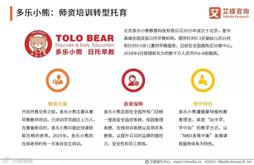 目前中国针对0-3岁婴幼儿提供养护、保育服务的机构,主要有金睿家、优儿学堂、茂楷婴童学苑、多乐小熊等。艾媒咨询分析师认为,中国婴幼儿托育市场刚起步,面对当前具有巨大需求却仍存顾虑的幼儿家庭,综合实力和品牌口碑是婴幼儿托育机构争夺市场的关键所在。