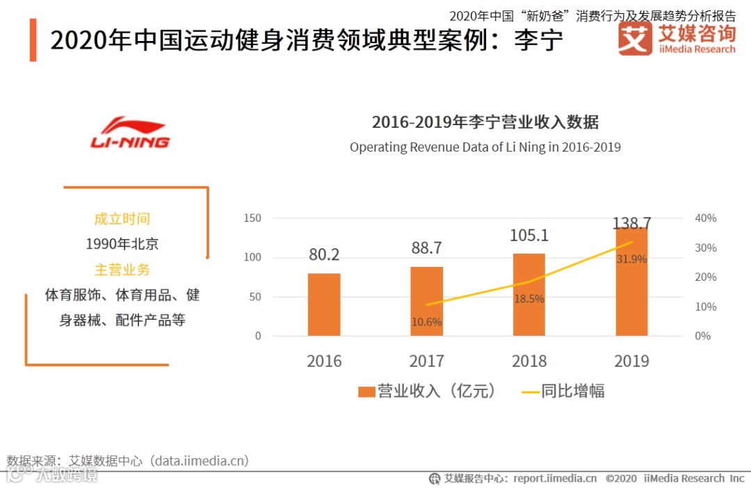 李宁作为运动健身类产品及服装品牌,其产品主要面向男性与年轻消费者,其品牌发展方向也针对主要消费群体进行转变,推动年轻化、国牌化发展,其2019年营业收入增长率达到31.9%,呈现出良好的发展势头。艾媒咨询分析师认为,李宁依靠自身的品牌定位与品牌影响力,对“新奶爸”群体有着较高的吸引力,带动了“新奶爸”群体在运动健身领域的总体消费水平。