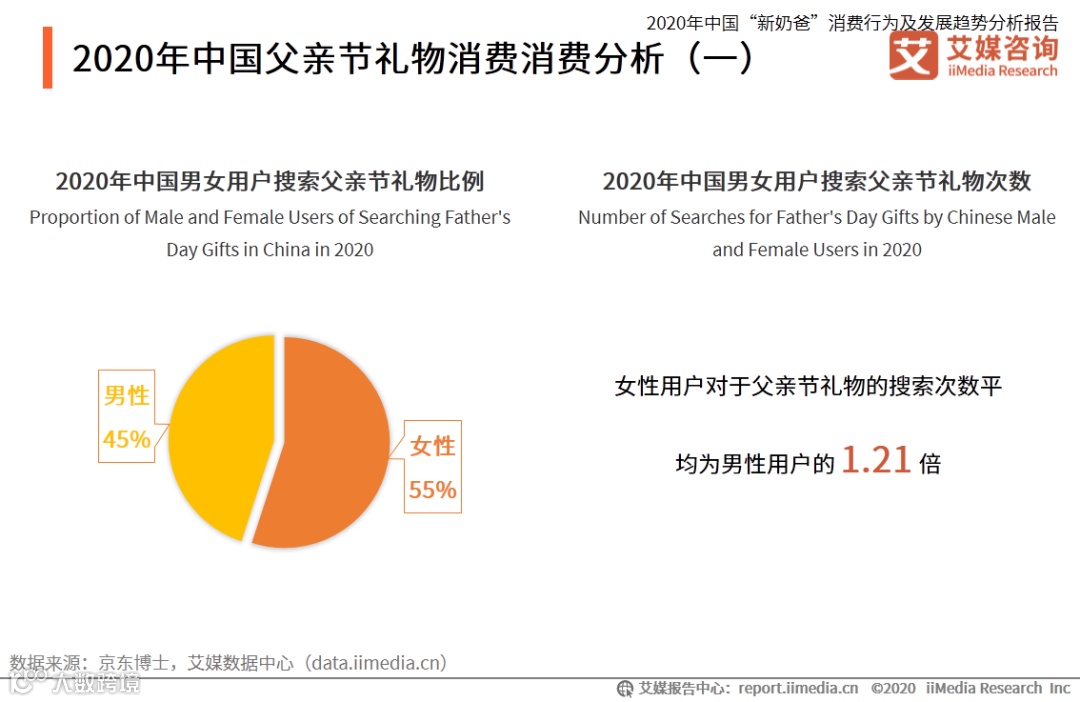 数据显示,2020年用户在搜索父亲节礼物时,女性用户比例较大,达到55%,且女性用户在搜索次数方面高于男性用户21个百分点。艾媒咨询分析师认为,女性用户作为礼物经济的主要消费力量,在为“新奶爸”群体购买父亲节礼物时同样占据着较大的比例,同时与男性用户相比,其较高的搜索次数反映出女性用户细心、有耐心与精挑细选的特点。