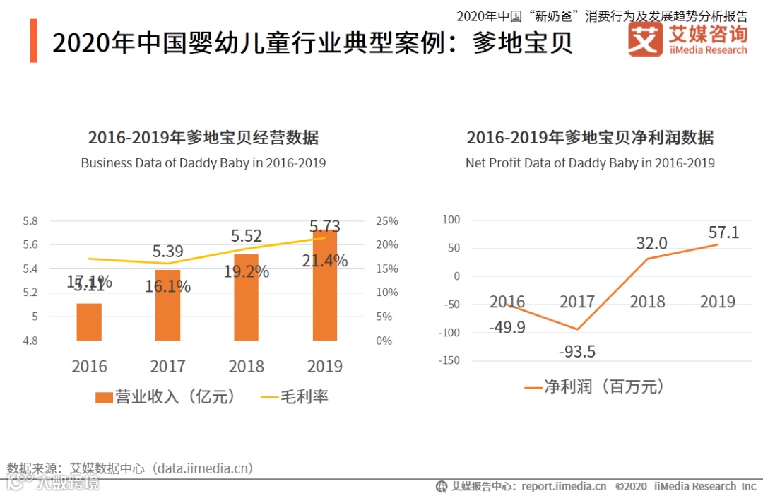 数据显示,爹地宝贝2016-2019年间保持着营业收入的正向增长,2019年营业收入达到5.73亿元,且于2018年实现净利润的扭亏为盈,反映了其良好的发展态势。艾媒咨询分析师认为,国内婴幼儿市场发展的巨大潜力,以及“新奶爸”群体在纸尿裤领域逐渐增长的消费能力与消费比例,为爹地宝贝等原本就具有一定影响力的婴幼儿品牌带来了持续的发展动力。