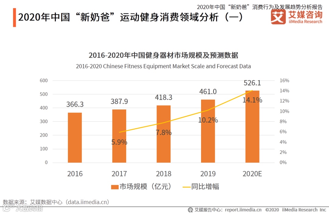 iiMedia Research (艾媒咨询)数据显示,中国运动健身行业保持着稳中有升的增长比例,2019年其市场规模达到461.0亿元,预计2020年将超过520亿元。艾媒咨询分析师认为,“新奶爸”群体受年龄、教育与环境的影响,在关注与其子女相关的婴幼儿领域消费外,对个人生活品质与形象提升的消费同样关注。近年来人们健康意识普遍提升,健身成为新风潮,而“新奶爸”群体也偏好通过运动和科学调理对自身进行保养与形体塑造。