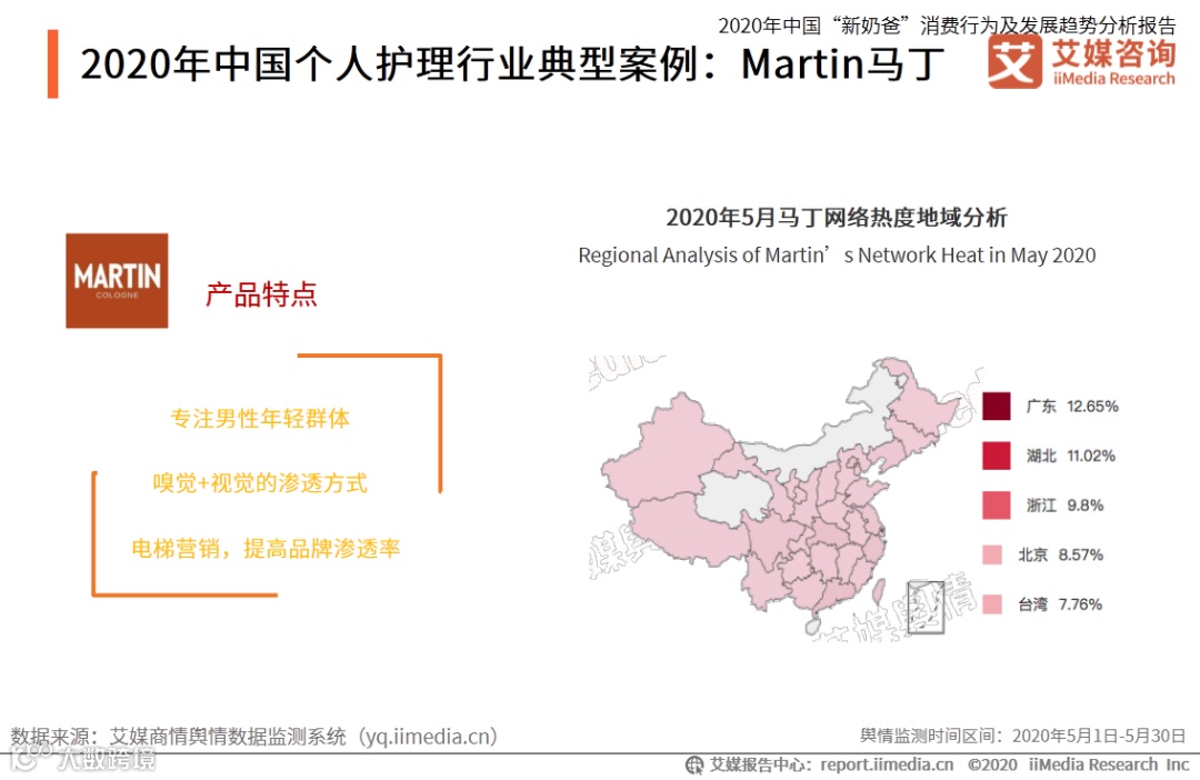 iiMedia Research(艾媒咨询)数据显示,马丁的网络热度主要集中于我国东南部省份,相对集中于一、二线城市。艾媒咨询分析师认为,马丁作为男性护理产品的典型企业,以高端、品质作为主要品牌形象,与“新奶爸”群体事业上小有所成、生活中追求时尚潮流的特点形成一致,从而在此基础上有效拓展了市场,提高了市场份额。