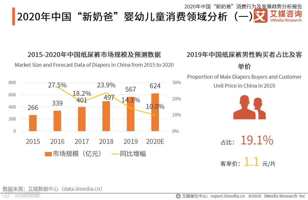 iiMedia Research (艾媒咨询)数据显示,2015-2019年中国婴幼儿行业纸尿裤市场规模不断扩大, 预计2020年将达到624亿元,其中,纸尿裤男性购买者比例达到19.1%,总体呈上升趋势。艾媒咨询分析师认为,婴幼儿童用品购买者的“去性别化”消费趋势逐渐增强,“新奶爸”群体在纸尿裤领域不断上升的消费比例反映了其消费思路与消费理念的变化。