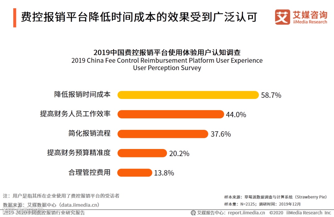iiMedia Research(艾媒咨询)数据显示,在表明所在企业有使用费控报销平台的受访者当中, 58.7%认为费控报销平台的使用有效降低了报销时间成本,44.0%认为其提高了财务人员工作效率,37.6%认为使用费控报销平台后报销流程得到简化。