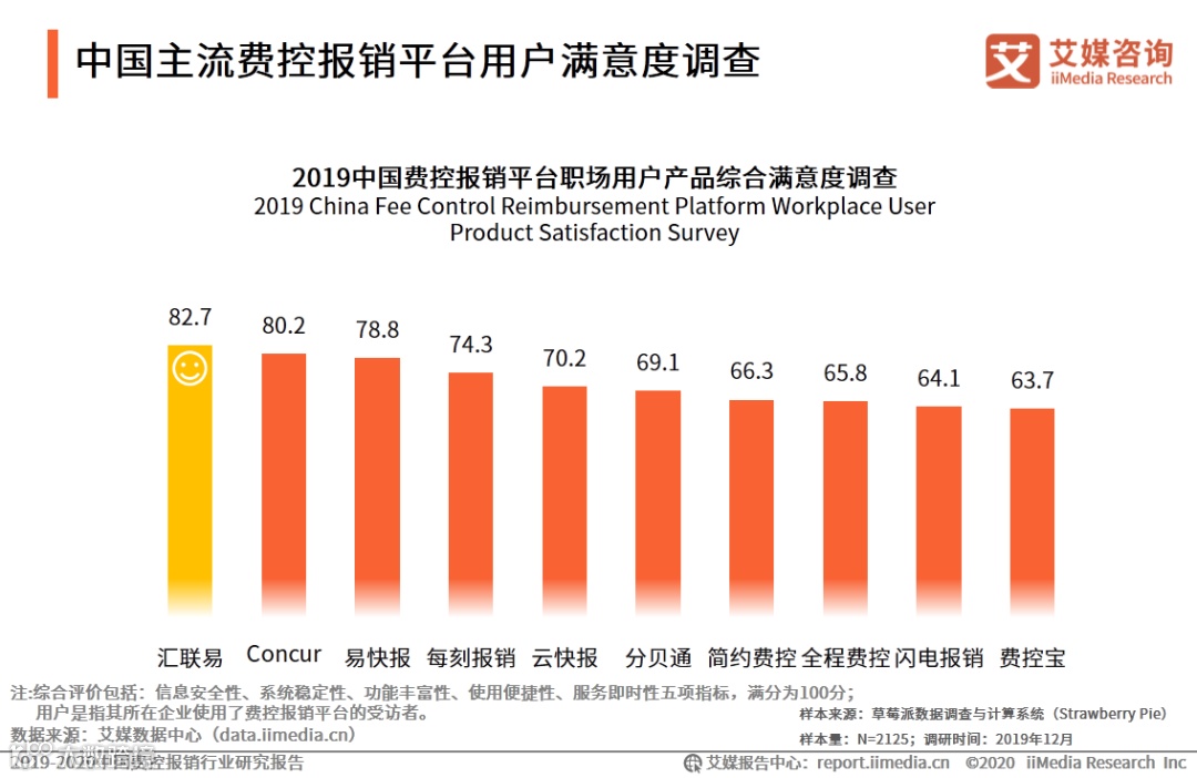 iiMedia Research(艾媒咨询)数据显示,在费控报销平台职场用户人群产品满意度调查中,汇联易的用户满意度评价最高,达82.7分;随后是Concur和易快报,评分分别为80.2分、78.8分。