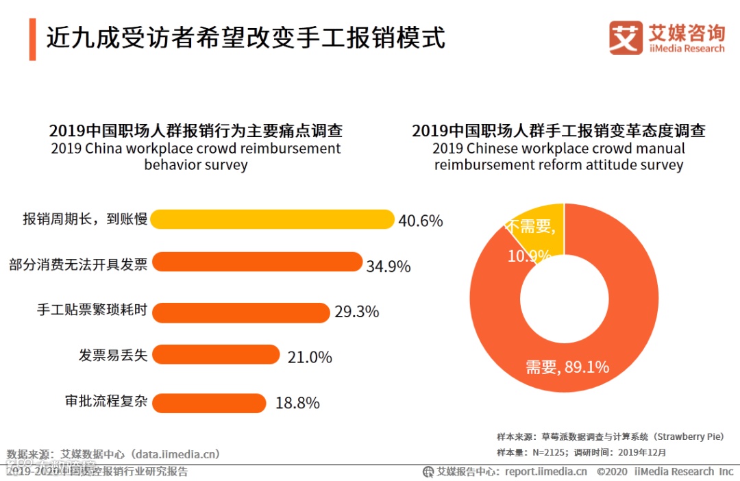 iiMedia Research(艾媒咨询)数据显示,职场人群报销痛点颇多,排在首位是报销周期长、到账慢,占比达40.6%。针对当前手工为主的报销模式,89.1%受访者认为该模式需要变革。艾媒咨询分析师认为,改变传统报销模式刻不容缓,费控报销行业在中国的发展前景十分乐观。