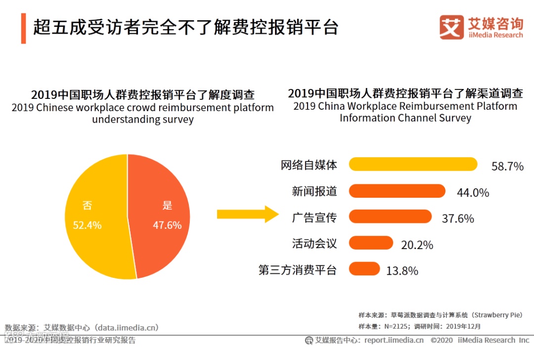 iiMedia Research(艾媒咨询)数据显示,52.4%的职场受访者表示对费控报销平台完全缺乏了解。在有所了解的受访者当中,网络自媒体是他们获取相关信息的主要渠道,占比达58.7%。艾媒咨询分析师认为,职场人群手动报销痛点以及变革意愿都较为强烈,但对可以改善手动报销痛点的费控报销平台却缺乏了解,意味着费控报销平台在市场教育和用户培养方面仍有较大进步空间。