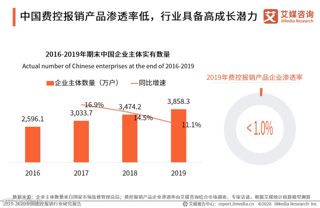 数据显示,2019年期末中国实有的企业主体数量为3858.3万户,同比增长11.1%。虽然企业数字化变革进程加速,但企业财税数字化程度并不高。费控报销作为财税数字化细分领域仍处在起步阶段,2019年在全国企业中的渗透率不足1.0%。艾媒咨询分析师认为,中国发票数字化市场正在国家强力推行下快速上升,这将带动电子发票下游环节的费控报销产品在企业主体中的渗透,费控报销行业有望迎来高速增长期。