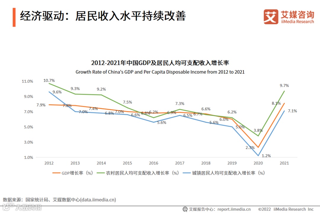 艾媒咨询分析师认为,居民人均可支配收入持续提升,且实际增速同步并略快于GDP增长,内需有望进一步扩大,利好乡村数字经济发展。