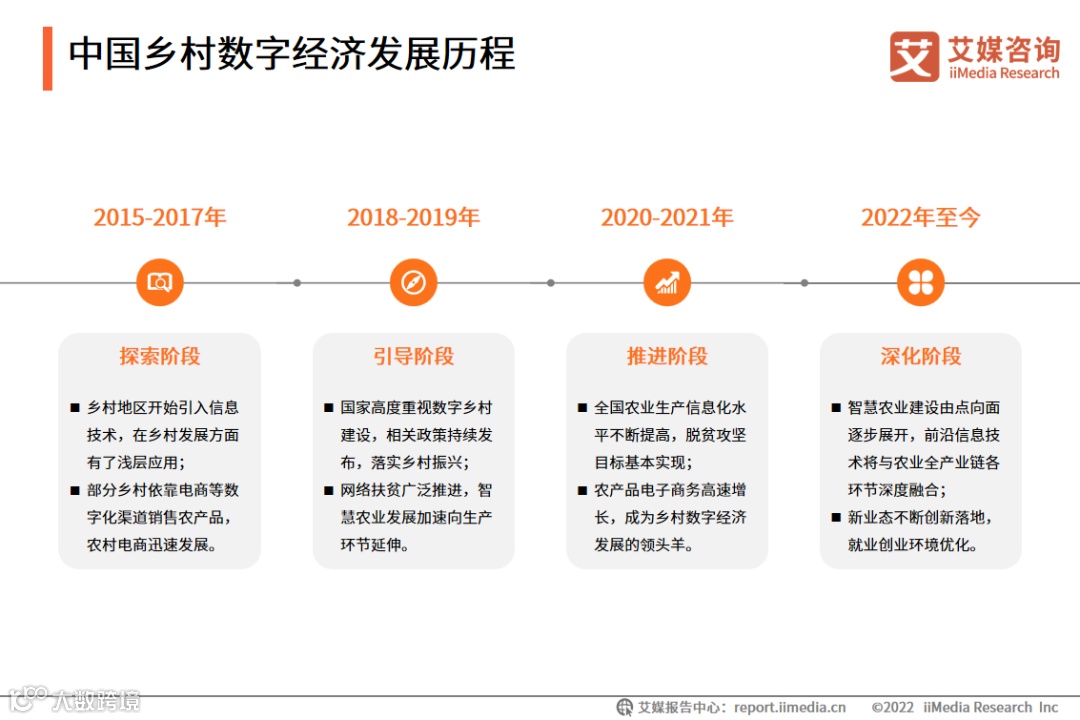 2020年全国脱贫攻坚目标基本实现,“十四五”规划指出加快推进数字乡村建设。2022年中央一号文件提到,推动乡村振兴取得新进展、农业农村现代化迈出新步伐,乡村数字经济进入深化阶段。