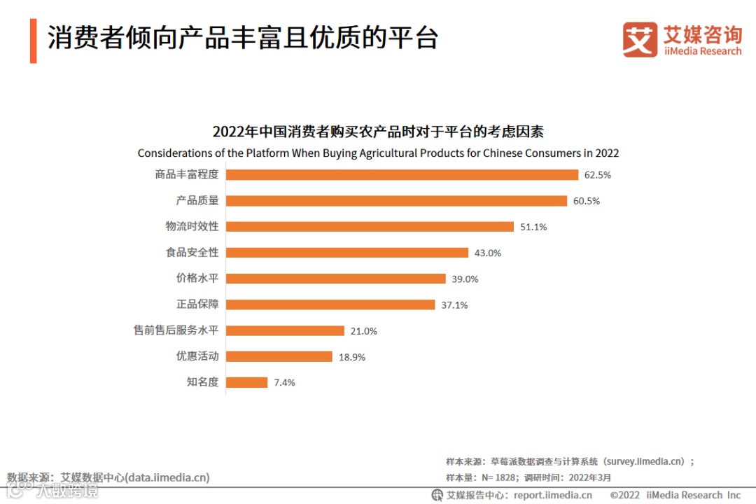 调研数据显示,国内消费者线上购买农产品时,着重考虑平台的商品丰富程度(62.5%)和产品质量(60.5%),对食品安全性(43.0%)和正品保障(37.1%)也比较关注。