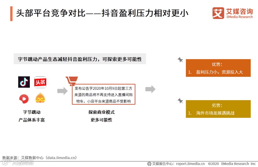 抖音对于电商商业模式的重视程度较高,并通过扶持抖音平台上商家资源建立平台电商业务。艾媒咨询分析师认为,抖音母公司字节跳动产品生态较为丰富,有今日头条等大流量产品,在盈利压力上相对快手更小,因此也有更多空间去挖掘短视频商业模式的创新。但近期抖音在海外市场发展受阻,Tik Tok风波也引发争议,对于其中国市场发展也存在一定影响。