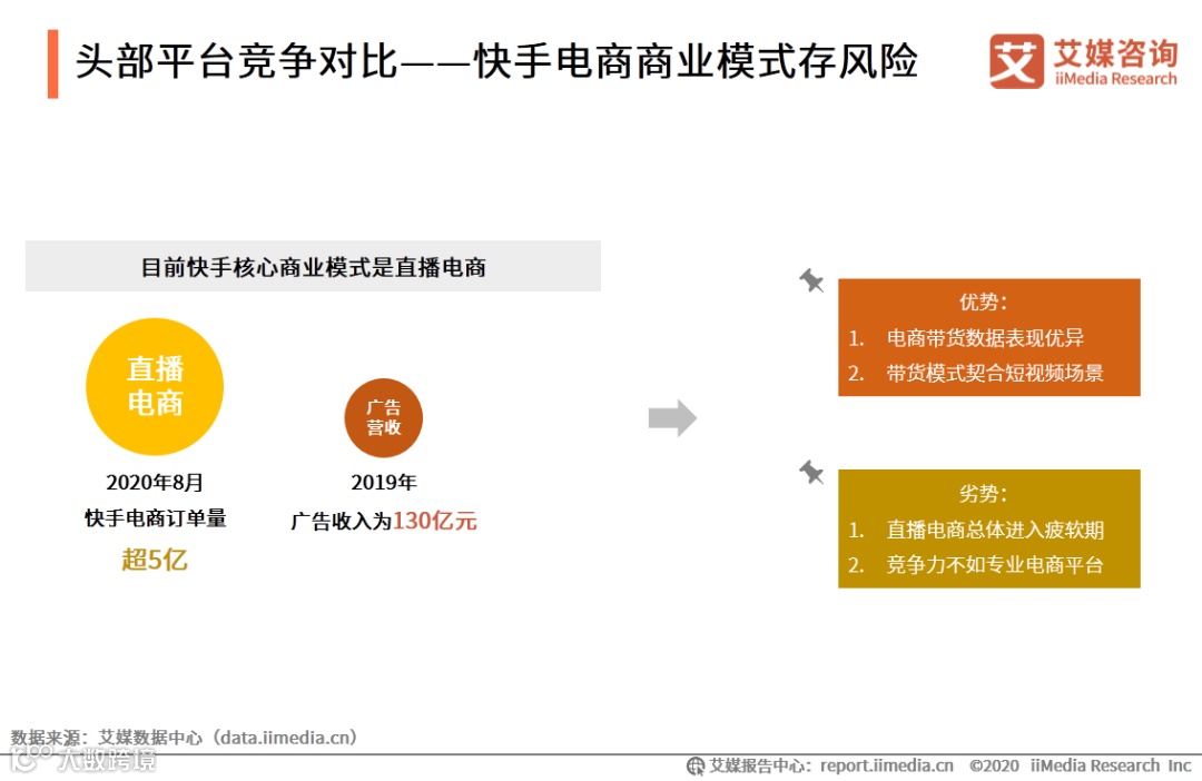 数据显示,2020年8月快手电商订单量超5亿。目前,快手比较核心的商业模式是直播电商,且进入2020年后表现也十分优异,是快手市场发力的重要助推力。艾媒咨询分析师认为,快手通过直播电商带货的模式有效实现平台商业化探索,带动自身增长。但与此同时,快手面临抖音带来的竞争压力巨大,而直播电商模式在经过年初的爆发后,正逐渐进入疲软期,如主播翻车、数据造假等问题层出不穷,长远来看电商商业模式发展仍然存在风险。