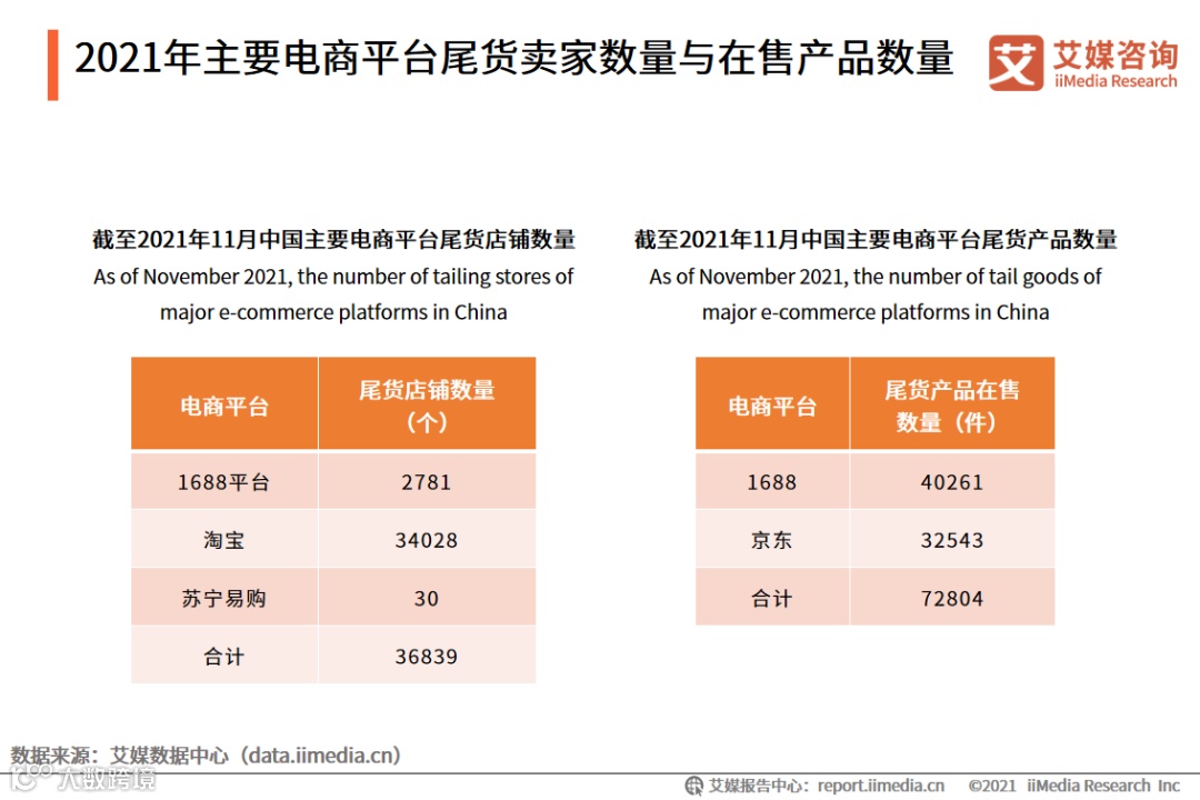 线上平台是尾货产品分销的重要渠道,尾货产品数量和卖家数量均已形成规模。iiMedia Research(艾媒咨询)数据显示,截至2021年11月中国主要电商平台合计尾货产品卖家数量36839家,合计尾货产品在售数量72804件,其余线上平台及线下市场的情况尚未统计。