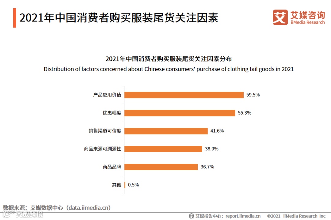对于消费者来说,服装商品本身的使用价值及优惠幅度是他们关注的重点,而商品的来源及品牌的关注度却相对较弱。iiMedia Research(艾媒咨询)数据显示,超55%的消费者表示购买时会关注尾货产品的应用价值和优惠幅度,仅36.7%的消费者表示购买时会关注商品的品牌。