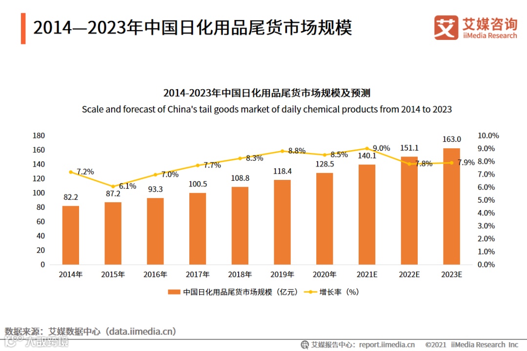 近年来日化用品尾货市场规模保持着高速增长, 规模不断扩大。iiMedia Research(艾媒咨询)数据显示,2020年中国日化用品尾货市场规模达到128.5亿元,较上年增长8.5%,预计2023年整体市场规模将突破160亿元。