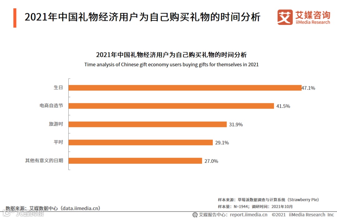 数据显示,中国礼物经济用户在生日时为自己购买礼物的比例是最高的(47.1%),其次为电商自造节(41.5%)和旅游时(31.9%)。艾媒咨询分析师认为,中国礼物经济用户在为自己购买礼物时大多会选择在一些有意义的日期比如生日或旅游等,但也有部分用户会在平时就给自己购买礼物。