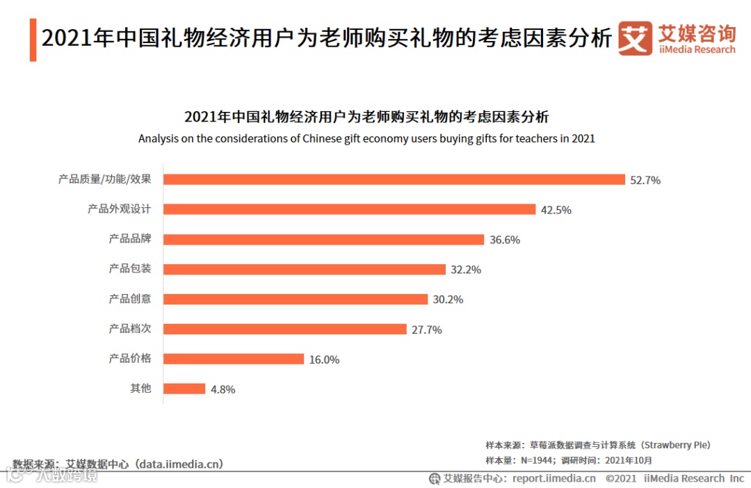 数据显示,中国礼物经济用户给老师赠送礼物时关注最多的还是产品的实际效果,占比52.7%,其次分别为产品外观设计(42.5%)和产品品牌(36.6%)。艾媒咨询分析师认为,中国礼物经济用户给老师赠送礼物时相对更加关注产品本身如产品的效果和外观、品牌,而不是产品包装、创意等。