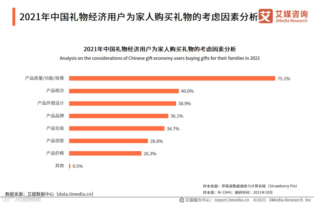 数据显示,中国礼物经济用户给家人赠送礼物时关注最多的还是产品的实际效果,占比75.1%,其次分别为产品档次(40.0%)和产品外观设计(38.9%)。艾媒咨询分析师认为,中国礼物经济用户给家人赠送礼物时相对产品外观、品牌等更加关注产品档次,说明用户相对更加重视在给家人赠送礼物时的仪式感。