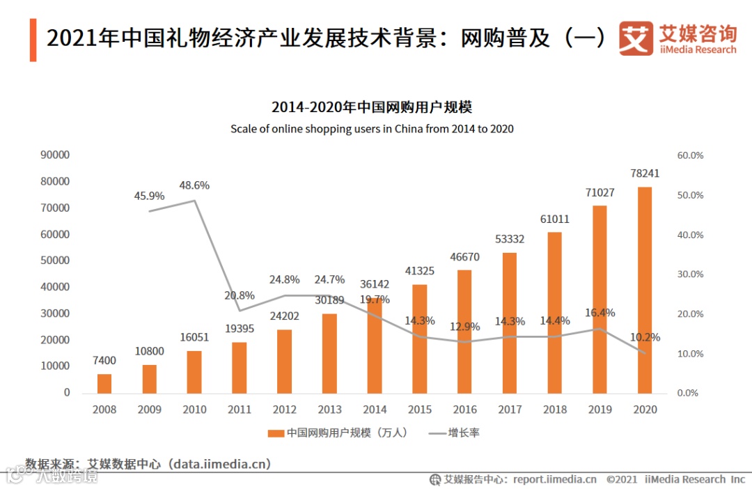 数据显示,2008-2020年中国网购用户规模逐年递增,从7400万人增至78241万人。艾媒咨询分析师认为,随着中国网购市场的逐渐普及,人们赠送礼物时的物理距离被打破,通过网购能够解决线下送礼不便的问题,一定程度上促进了礼物经济产业的发展。