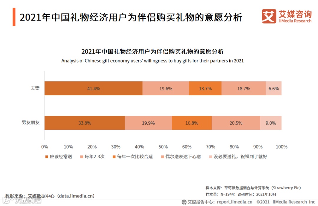 数据显示,中国礼物经济用户中认为应该经常送夫妻和男女朋友礼物的比例分别为41.4%、33.8%,认为应该每年送1-3次的比例为33.3%、36.7%,认为应该少送或不用送的比例分别为25.3%、29.5%。艾媒咨询分析师认为,中国礼物经济用户超过7成都认为应该每年至少给伴侣送一次及以上的礼物,认为对于伴侣的情感是需要通过礼物来表达的。